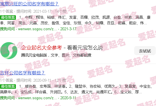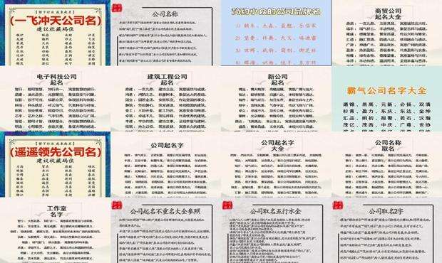 300个吉祥的公司名称的集合。除了有个成立公司的好名声,这个生肖吉日也是浩、朔、朝、金、二、睿、青2的事业,并以感性的方式命名。一些公司难以注册他们的名字。