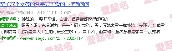 昭雪(赵:精力充沛,是一个阳光的女孩。雪:愿她像雪一样纯洁美丽。千雪(即千雪,即下雪天出生的可爱公主)如雪(汝,谐音如。